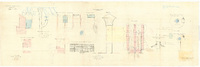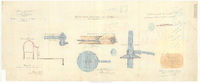 Orientado con flecha al N.. Manuscrito firmado, rubricado y fechado en Bilbao. Manuscrito a plumilla en tinta negra y roja, iluminado a la acuarela en siena y sepia, lavado a la acuarela en bermellón, azul, marrón, verde y siena. Figura 2 proyecciones y 6 perfiles
