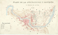 Plano de la Jurisdiccion y Proyecto de ensanche de la villa de Bilbao Mención de responsabilidad y fecha tomadas del catálogo del SGE: "Región Vasco-Navarra. Provincias de Alava y Vizcaya. Siglos XVI a XIX". 1968, p. 130. Escala también dada en forma gráfica de 500 metros. Orografía por curvas de nivel. Tabla de signos convencionales para indicar el límite de la jurisdicción, las estaciones de la linea de perímetro y las clases de edificios. Toponimia de las principales calles de la villa. Iluminado en varios colores. Es una reducción del documento de sign. SGE-Ar.F-T.1-C.3-129