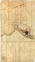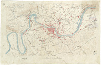 Croquis de Bilbao y sus inmediaciones, en que se demarca la linea de las fortificaciones con lineas de carmín Indicados caminos. Manuscrito a plumilla en tinta negra y roja. Explicación de las claves alfabéticas y numéricas. Indicada con flecha la dirección de la ria