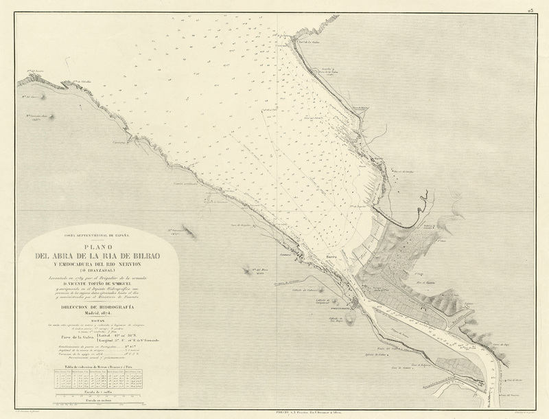 Plano del Abra de la Ria de Bilbao y embocadura del rio Nervion (ó Ibayzabal) / Levantado en 1789 por el Brigadier, de la armada D. Vicente Tofiño Sn. Miguel, y enriquecido en el Depósito Hidrográfico con presencia de los mejores datos ejecutados hasta el dia y suministrados por el Ministerio de Fomento ; J. de Lorenzo lo formó ; J. Riudavets lo grabó