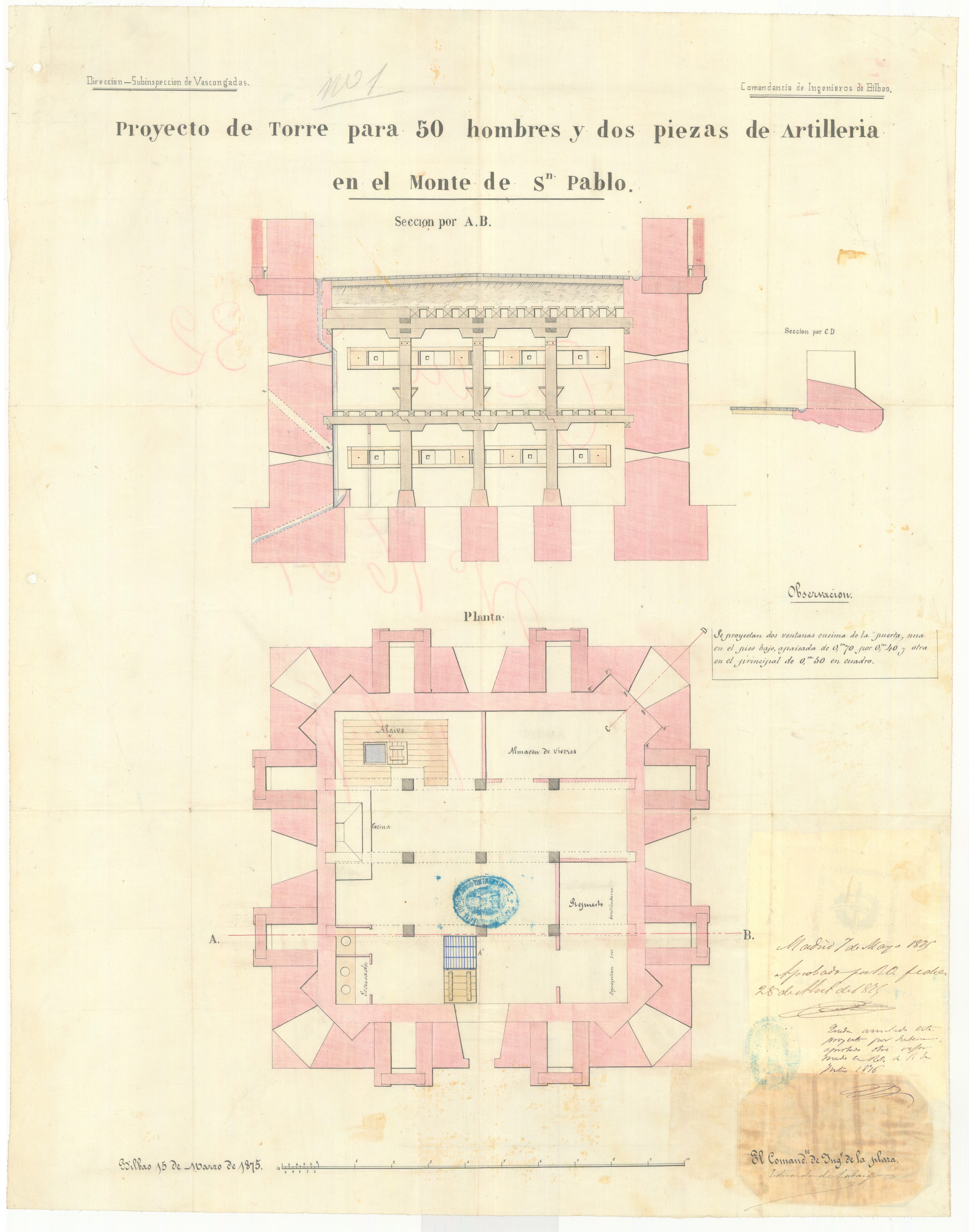 Proyecto de Torre para 50 hombres y dos piezas de artilleria en el Monte de Sn. Pablo / Dirección Subinspeccion de Vascongadas, Comandancia de Ingenieros de Bilbao ; El Comandte. de Ing. de la Plaza Eduardo de Labaig