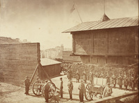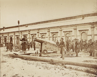 Batería en Campo Volantín Toma parcial del interior de la puerta y bateria de la Marina, ubicada justo al comienzo del paseo del Campo Volantín, en la que se puede observar a los soldados de marina preparar las piezas de artillería y una caja abierta de munición, durante El Sitio carlista de Bilbao de 1874. Toma atribuida a Carlos Monney.