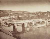 Puente de Ysabel 2ª Toma general del puente de El Arenal sobre la ría de Bilbao tras sufrir los efectos de la riada, que arrojó las gabarras sobre los pilares del puente el domingo 12 de abril de 1874. Junto al puente, las embarcaciones que bloquearon los arcos. Posteriormente fueron dinamitadas para que las aguas pudiesen pasar. Atribuida a Carlos Monney.