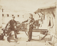 Batería en Campo Volantín Retrato de figura entera de dos oficiales liberales de la puerta y batería de la Marina, situada al comienzo del paseo del Campo Volantín, durante la defensa de Bilbao en El Sitio carlista de 1874. Junto a ellos podemos ver dos piezas de artillería y una caja de munición.