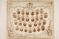 Diputación y Guardia Foral de Bizkaia Retratos de torso en mosaico de imágenes camée de los miembros de la Diputación y oficiales y suboficiales de la Guardia Foral de Vizcaya en 1873. El tercero de izquierda a derecha de la línea superior es José María Murga, el Moro Vizcaíno, a la sazón Presidente de la Diputación. La orla aparece enmarcada por una litografía con dos miñones a los lados, motivos vegetales y un escudo de Vizcaya rematando la imagen. Retratos atribuidos a Carlos Monney.
