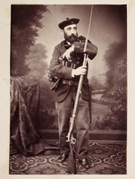 Voluntarios auxiliares Retrato de figura entera de voluntario auxiliar liberal, defensor de Bilbao durante El Sitio de 1874, apoyado en su mosquetón. Retrato de estudio atribuido a Carlos Monney, que estaba en el número quince de la calle Correo de Bilbao.