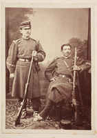 Soldados de la guarnición Retrato de figura entera de dos soldados liberales, uno de pie y otro sentado, defensores de Bilbao durante El Sitio de 1874, con sus respectivos mosquetones. Retrato de estudio atribuido a Carlos Monney, que estaba en el número quince de la calle Correo de Bilbao.