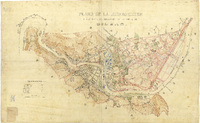 Plano de la jurisdicción y proyecto de ensanche de la villa de Bilbao / [Cuerpo de Estado Mayor del Ejército] Mención de responsabilidad y fecha tomadas del catálogo del SGE: "Región Vasco-Navarro. Provincias de Alava y Vizcaya. Siglos XVI a XIX". 1968, p. 129. Escala también dada en forma grafica de 400 metros. Orientado al norte geográfico. Orografía por curvas de nivel equidistantes 2,5 metros. Tabla de signos convencionales para indicar el límite de la jurisdicción, las estaciones de la línea de perímetro y las clases de edificios. Toponimia de las principales calles de la villa. Delineado a varias tintas. El documento SGE-Ar.F-T.1-C.3-130 es una reducción a 1:5000 de calles. Delineado en varios colores. El documento SGE-Ar.F-T.1-C.3-130 es una reducción a 1:5000 de éste