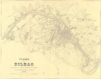 Plano de Bilbao y su Ría / [Cuerpo de Ingenieros Militares del Ejército]. Plano de Bilbao. Comprende parte de los términos municipales de Bilbao, Baracaldo, Sestao, Portugalete, Gecho y Lejona, en la provincia de Vizcaya. Mención de responsabilidad y fecha tomada del catálogo del SGE: "Región Vasco-Navarra. Provincias de Alava y Vizcaya. Siglos XVI a XIX". 1968, p. 125. Orografía por curvas de nivel equidistantes 5 metros. Delineado en varios colores