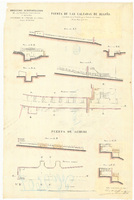 Puerta de las Calzadas de Begoña, Bilbao 1873 Manuscrito firmado, rubricado y fechado en Bilbao. Manuscrito a plumilla en tinta negra, lavado a la acuarela en bermellón, marrón y siena. Figura 1 proyección horizontal y 4 perfiles. Incluye 1 proyección horizontal y 3 perfiles de la 'Puerta de Achuri'