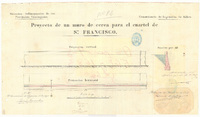 Proyecto de un muro de cerca para el cuartel de Sn. Francisco / Direccion Subinspeccion de las Provincias Vascongadas, Comandancia de Ingenieros de Bilbao ; Eduardo de Labaig Manuscrito firmado, rubricado y fechado en Bilbao. 'V.B. El Comandante de Yngenieros de la Plaza Saturnino Fernandez, Examinado P.A. Ros', con firma y rúbrica. Manuscrito a plumilla en tinta negra, iluminado a la acuarela en azul y carmín. Figuran 2 proyecciones y 1 sección. Aparece en el lateral derecho 'Madrid 8 Mayo 1876 Aprobado por R.O. fha. 22 Abril 1876'