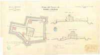 Plano del fuerte de Torre - Urizar, Vizcaya 1875 Manuscrito firmado, rubricado y fechado en Bilbao. 'Examinado El Ingeniero Comandante Saturnino Fernandez', con firma y rúbrica. Manuscrito a plumilla en tinta negra, lavado a la acuarela en siena, ocre, carmín, amarillo y negro, al verso. Figura la planta y 2 perfiles. Aparece en el ángulo inferior izquierdo: 'Madrid 30 de Setiembre de 1875. Aprobado por R.O. de 22 Septiembre', con rúbrica
