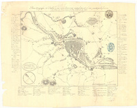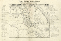 Plano de Bilbao y sus inmediaciones manifestando el sitio puesto por los facciosos desde el 24 de Octubre hasta el 25 de Diciembre de 1836 Escala gráfica de 1500 pies castellanos [= 7 cm]. Orientado con lis en nudo de cuatro rumbos. Orografía por normales. Relación de los principales edificios de la ciudad y de las defensas de la misma, de las del campo enemigo y de las obras proyectadas, indicadas por clave alfanumérica. Mediante colores se señalan las obras realizadas en Bilbao, antes y durante el sitio, asi como las que se proyectan y las ya hechas en el campo enemigo. Se inscribe dentro de la primera guerra carlista o guerra de los siete Años (1833-1840). Delineado en varios colores