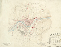 Plano de Bilbao y reconocimiento de sus inmediaciones hasta la distancia de 1 kilómetro / Cuerpo de Estado Mayor del Ejército. Depósito de la Guerra Mención de responsabilidad tomada del sello estampado del mencionado "Cuerpo de Estado Mayor". Fecha tomada del catálogo del SGE: "Región Vasco-Navarra. Provincias de Alava y Vizcaya. Siglos XVI a XIX". 1968, p. 133. Orografía por curvas de nivel equidistantes 3 metros. Toponimia de las principales calles de la villa. Iluminado en varios colores. Identificación de propietarios en Albia. Casa del cónsul inglés.
